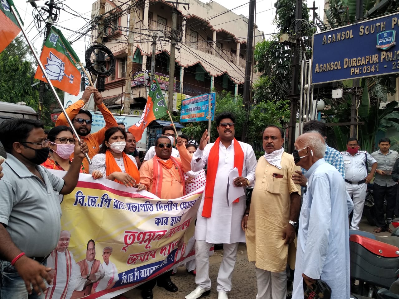 बंगाल मिरर, राहुल तिवारी, आसनसोल : बुधवार को पश्चिम बंगाल प्रदेश भाजपा अध्यक्ष सह खड़गपुर से भाजपा सासंद दिलीप घोष पर उत्तर 24 परगना जिले के राजारहाट इलाके में कुछ अराजक तत्वों ने हमला किया था। भाजपा हमले का आरोप टीएमसी पर लगा रही है। इस हमले के बाद से राज्य भर में भाजपा कर्मियों द्वारा लागातार विरोध प्रदर्शन किया जा रहा है। इसी कड़ी में गुरुवार को आसनसोल जिला भाजपा कमिटी की ओर से आसनसोल दक्षिण, आसनसोल उत्तर, हीरापुर समेत कई अन्य थानों के घेराव कर प्रदर्शन किया गया। प्रदर्शन कर रहे भाजपा नेता दिलीप घोष पर हुए इस हमले में कारवाई करते हुए आरोपियों की जल्द गिरफ्तारी की मांग की। आसनसोल में मंडल दो के प्रदर्शन में अध्यक्ष सुदीप चौधरी, पार्षद आशा शर्मा समेत बड़ी संख्या में कार्यकर्ता मौजूद थे।