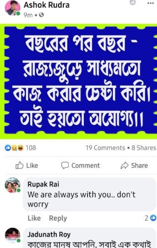 দলের টিকিট না পেয়ে ফেসবুক পেজে মন্তব্য শিক্ষক সংগঠন রাজ্য সভাপতির বেঙ্গল মিরর, রাজা বন্দোপাধ্যায়, আসানসোল, ৫ মার্চঃ আসানসোল দক্ষিণ … Continue reading জামুড়িয়া, রানিগঞ্জ ও আসানসোল দক্ষিণ বিধান সভার প্রার্থী নিয়ে তৃনমুল কংগ্রেসের কর্মীদের মধ্যে অসন্তোষ, সোশাল মিডিয়ায় তোলপাড়
