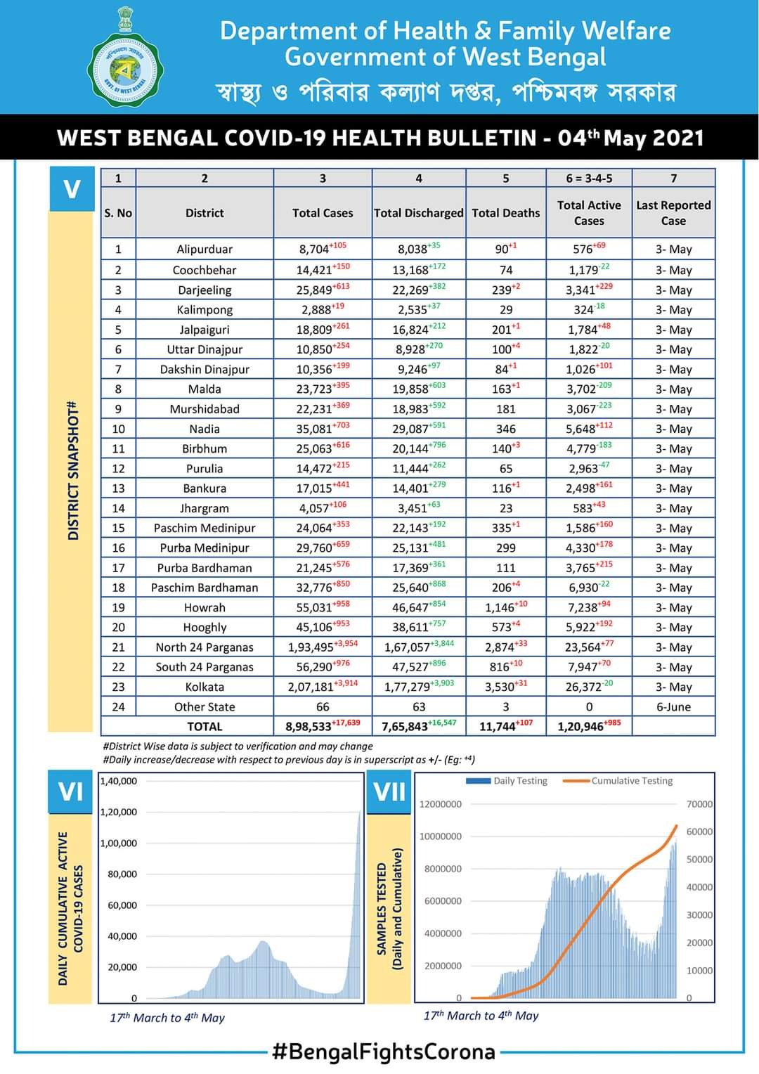 বেঙ্গল মিরর, আসানসোল, সৌরদীপ্ত সেনগুপ্ত : পশ্চিম বর্ধমানে করোনা ঝড় অব্যাহত রয়েছে। সোমবার রাতে প্রকাশিত বুলেটিন অনুসারে, গত 24 ঘণ্টার মধ্যে জেলায় করোনা সংক্রামিত 4 জনের মৃত্যু হয়েছে। জেলায় মোট 850 জন সংক্রামিত হওয়ার পরে, সক্রিয় সংক্রামিত মানুষের সংখ্যা 6930 তে পৌঁছেছে। একই সময়ে, জেলায় সংক্রামিত ব্যক্তিদের মোট সংখ্যা 32776 পৌঁছে গিয়েছে। যদিও মৃতের সংখ্যা 206 হয়েছে।