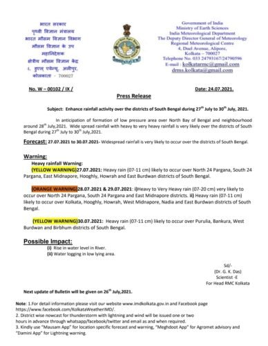 दक्षिण बंगाल में 27 से 30 तक बारिश का अलर्ट