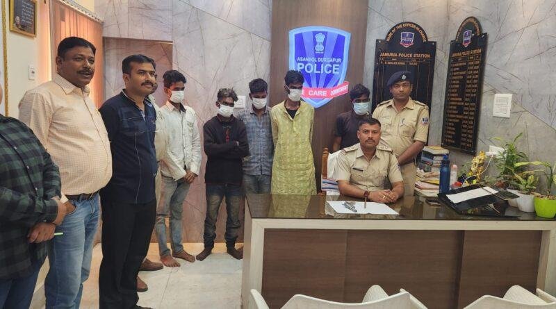 बंगाल मिरर, जामुड़िया:जामुड़िया थाना पुलिस द्वारा बड़ी सफलता हांसिल करते हुए डकैती की योजना बनाते पांच लोगों को असलहा के साथ गिरफ्तार किया गया।वही गिरफ्तार सभी अपराधियों को शनिवार को आसनसोल जिला कोर्ट में चलान कर दिया गया।इस विषय में जानकारी देते हुए जामुड़िया थाना प्रभारी राहुल देव मंडल ने बताया कि शुक्रवार रात लगभग 11:45 बजे रात्रि गश्ती लगा रहे पुलिस अधिकारी को सूत्रों से खबर मिली कि अखलपुर शमशान घाट के पास 8-9 लोगों एकत्रित है।वही सूचना मिलने पर जामुड़िया थाना पुलिस दल बल के साथ छापामारी किया जिसमें पांच लोगों को पकड़ा गया जबकि डकैतों के अन्य तीन साथी अंधेरे का लाभ उठा मौक से फरार हो गए।