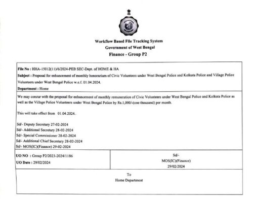 बंगाल मिरर, कोलकाता : मुख्यमंत्री ममता बनर्जी ने बजट में घोषणा की थी कि राज्य के पुलिस विभाग में काम करने वाले सिविक वालंटियर्स के वेतन में एक हजार रुपये की वृद्धि की जायेगी। यह वृद्धि एक अप्रैल 2024 से प्रभावी होगा। बजट में हुई घोषणा के बाद राज्य के गृह विभाग द्वारा इससे संबंधित फाइल तैयार की गई। जिसे वित्त मंत्री ने गुरुवार को साइन कर दिया है। यानि की राज्य में कार्यरत लाखों सिविक वोलेंटियर्स को अब एक हजार रुपये बढ़ा हुआ वेतन मिलेगा। यह अप्रैल माह से प्रभावी होने से मई महीने में उन्हें बढ़े हुए वेतन का भुगतान किया जायेगा। लोकसभा चुनाव को लेकर आशंका थी कि कहीं इसमें विलंब न हो जाये, लेकिन सरकार ने इसे चुनाव घोषणा से पहले ही मंजूरी दे दी है।