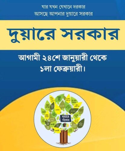 ‘২১-এর বিধানসভা ভোটের আগে, ‘দুয়ারে সরকার’ প্রকল্প ঘোষণা করেন মুখ্যমন্ত্রী। ওই বছরের পয়লা ডিসেম্বর থেকে শুরু হয় এই প্রকল্প। বিভিন্ন এলাকায় শিবির করে, এক ছাতার তলায় একাধিক সরকারি প্রকল্পের পরিষেবা প্রদানের কর্মসূচিই হল’দুয়ারে সরকার’।