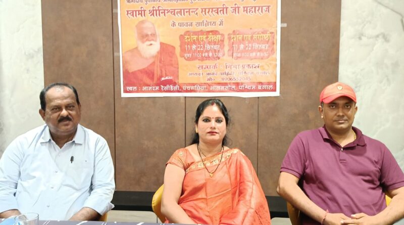 बंगाल मिरर, आसनसोल : पुरी के शंकराचार्य स्वामी श्री निश्चलानंद सरस्वती जी महाराज का आनंदम रेजिडेंसी पंचगछिया में 11 सितंबर को आगमन होने जा रहा है उसी सिलसिले में आज आसनसोल के सेन रेले रोड इलाके में स्थित एक निजी होटल में एक संवाददाता सम्मेलन का आयोजन किया गया यहां पर आनंद वाहिनी के पश्चिम बंगाल और बिहार प्रदेश के अध्यक्षा निभा प्रकाश आसनसोल चैंबर ऑफ़ कॉमर्स के सचिव शंभूनाथ झा तथा गौरव मिश्रा पत्रकारों से रूबरू हुए इस मौके पर निभा प्रकाश ने कहा कि पुरी के शंकराचार्य का 11 सितंबर को पंचगछिया में आगमन हो रहा है वह 22 सितंबर तक रहेंगे उन्होंने कहा कि पिछले साल भी हो यहां पर आए थे और तीन दिनों के लिए आसनसोल में उनके प्रवास हुआ था लेकिन इस साल वह 11 दिनों तक आसनसोल में रहेंगे और भक्तों से संबंध स्थापित करेंगे ।