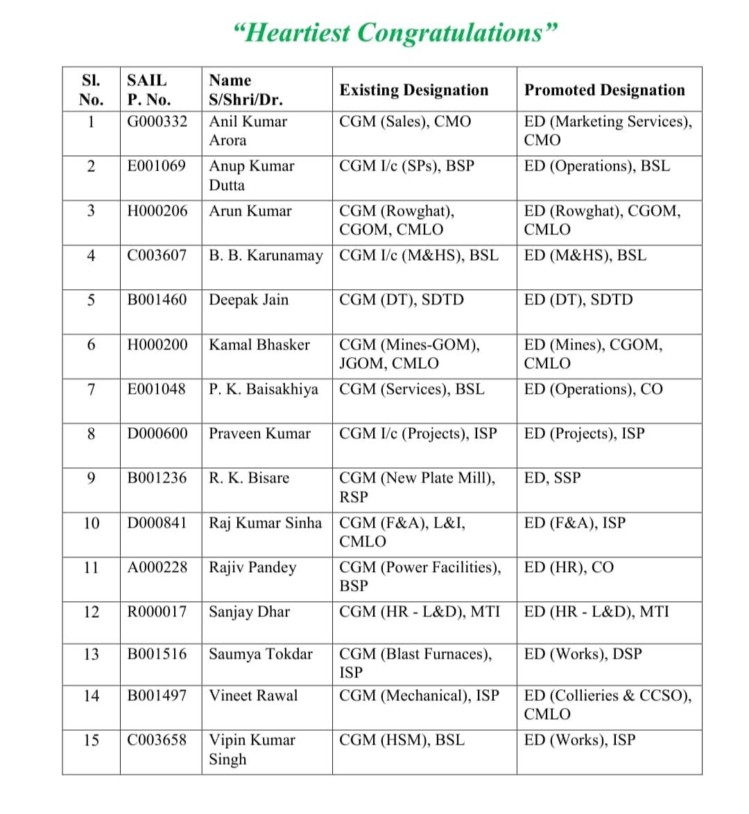 SAIL 15 CGM प्रमोशन पाकर बने ED, ISP को मिले 3