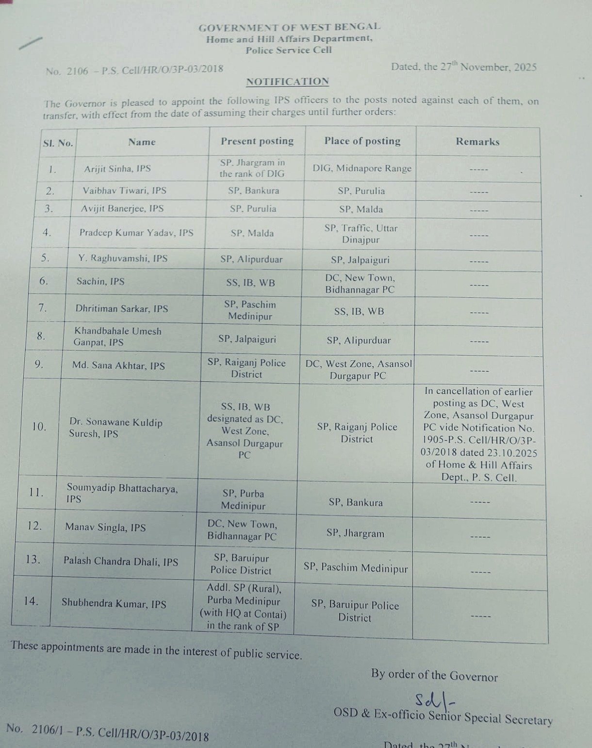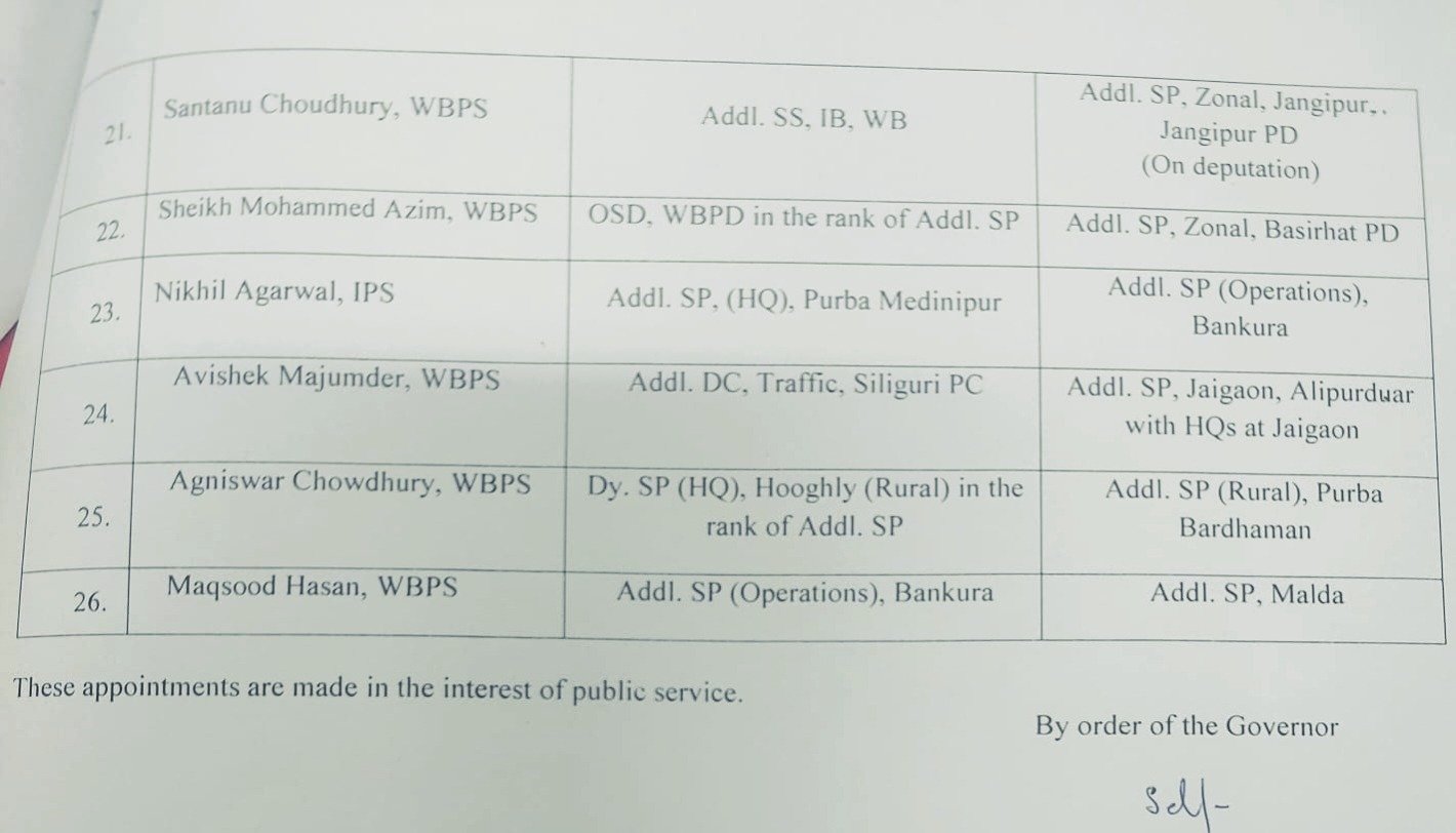 WBP : बड़े पैमाने पर फेरबदल, 14 SP और 26 ASP स्तर के अधिकारियों का तबादला