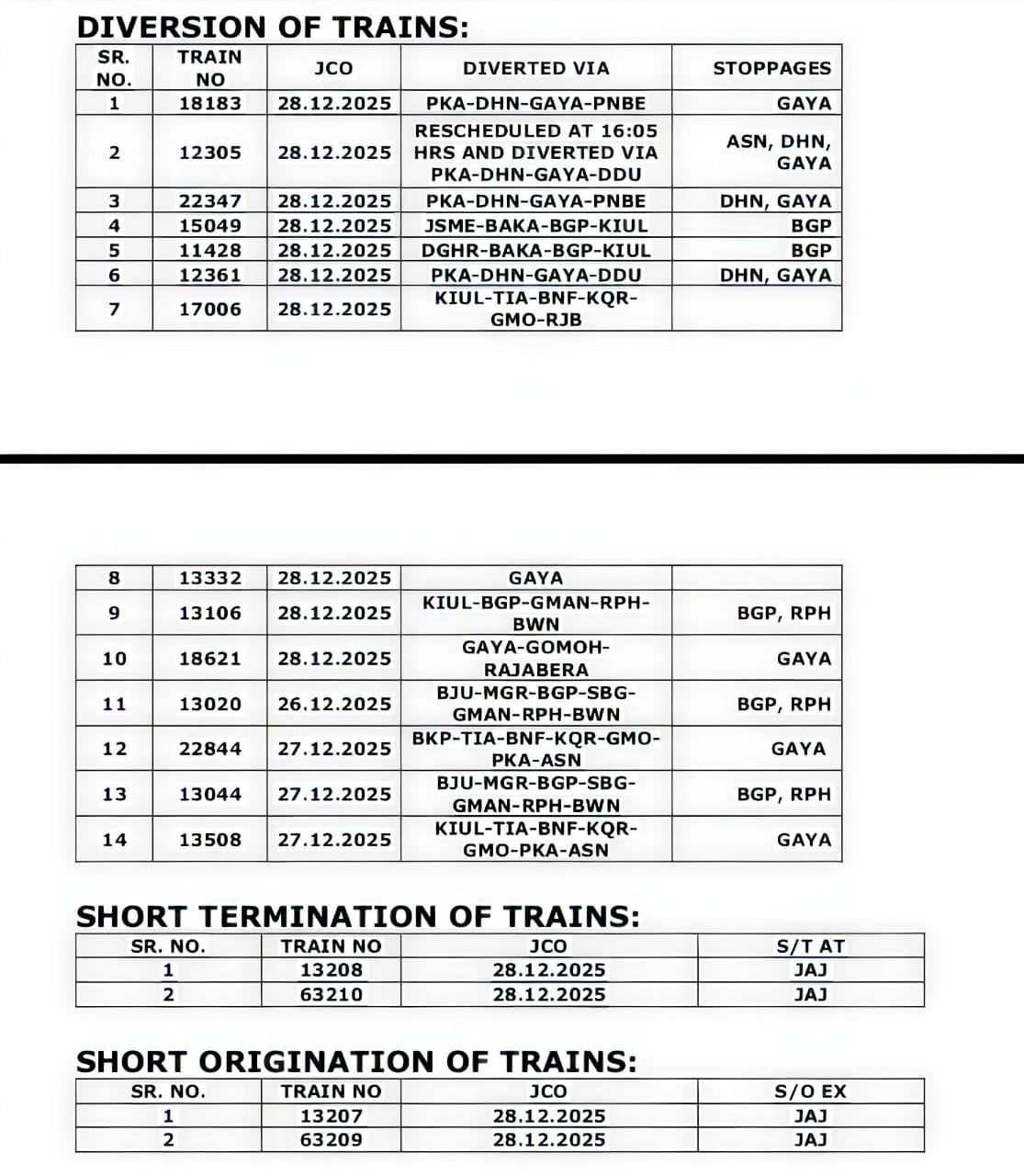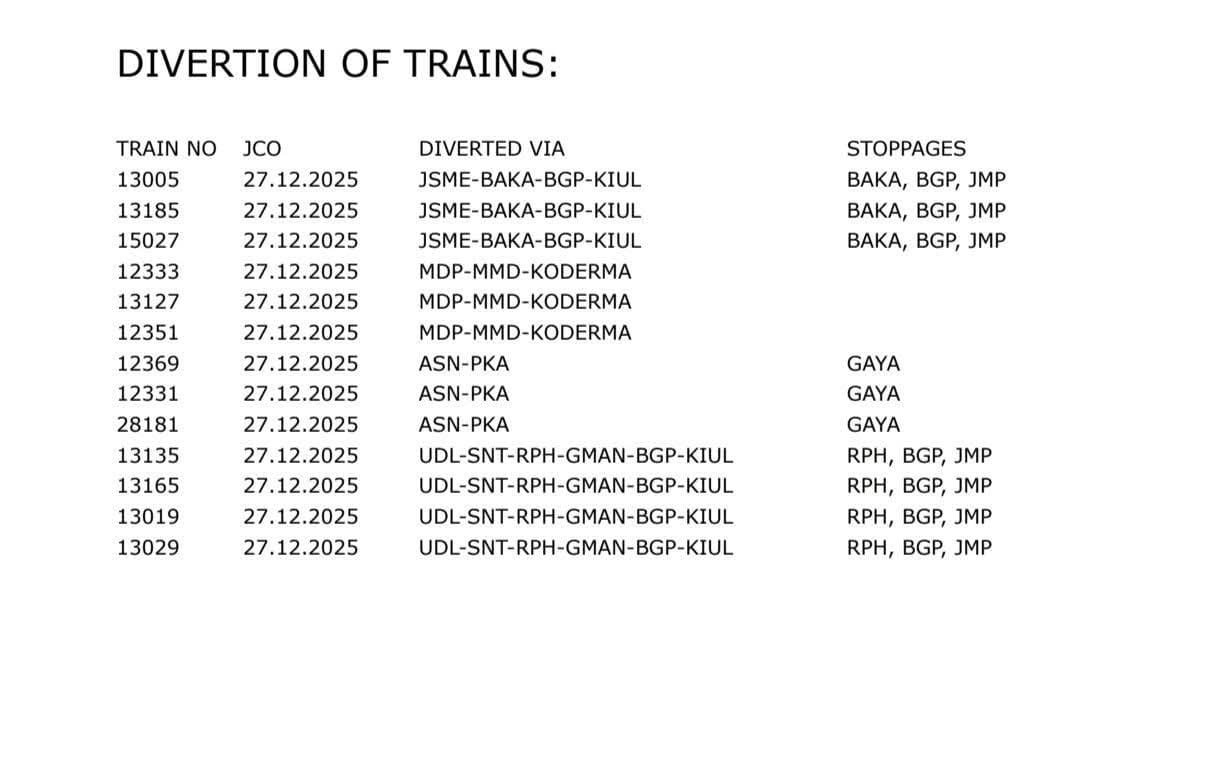27.12.2025 की रात लगभग 23:30 बजे, जसीडीह–झाझा रेलखंड में लाहाबन और सिमुलतला स्टेशनों के बीच ट्रैक में अवरोध उत्पन्न होने के कारण इस खंड में रेल परिचालन प्रभावित हुआ है। इसके परिणामस्वरूप, जसीडीह–झाझा सेक्शन से होकर चलने वाली अप एवं डाउन दिशा की लंबी दूरी की ट्रेनों को या तो डायवर्टेड रूट से चलाया जा रहा है अथवा नियंत्रित (कंट्रोल) किया गया है।
