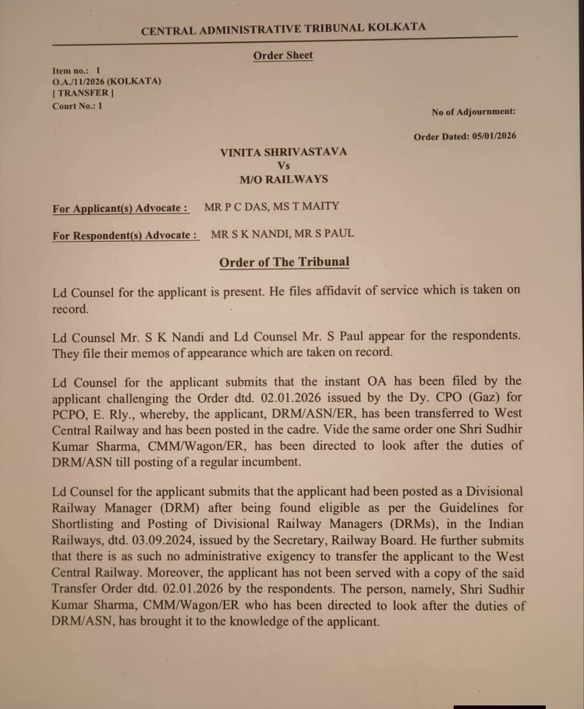 DRM विनीता श्रीवास्तव ने अपने स्थानांतरण आदेश को केंद्रीय प्रशासनिक न्यायाधिकरण (CAT), कोलकाता में चुनौती दी है। उन्होंने नए DRM के रूप में नियुक्त सुधीर शर्मा को अब तक पदभार नहीं सौंपा है। उनके वकील का कहना है कि बिना किसी स्पष्ट प्रशासनिक आवश्यकता के उन्हें वेस्ट सेंट्रल रेलवे भेजा गया और ट्रांसफर ऑर्डर की प्रति भी उन्हें उपलब्ध नहीं कराई गई। स्थानांतरण की जानकारी उन्हें अनौपचारिक रूप से सुधीर कुमार शर्मा के माध्यम से दी गई।CAT कोलकाता में हुई सुनवाई के दौरान रेलवे और DRM—दोनों पक्षों की उपस्थिति दर्ज हुई। सुनवाई के बाद ट्रिब्यूनल ने मामले को स्वीकार करते हुए रेलवे से पूछा कि बिना स्पष्ट प्रशासनिक आवश्यकता के उसी दिन ट्रांसफर और चार्ज सौंपने का क्या औचित्य था। रेलवे के वकील ने जवाब दाखिल करने के लिए समय मांगा है।ट्रिब्यूनल ने अगली सुनवाई की तारीख 08 जनवरी 2026 तय करते हुए तब तक यथास्थिति बनाए रखने और आवेदक (DRM) के खिलाफ कोई दमनात्मक कार्रवाई न करने का आदेश दिया है।