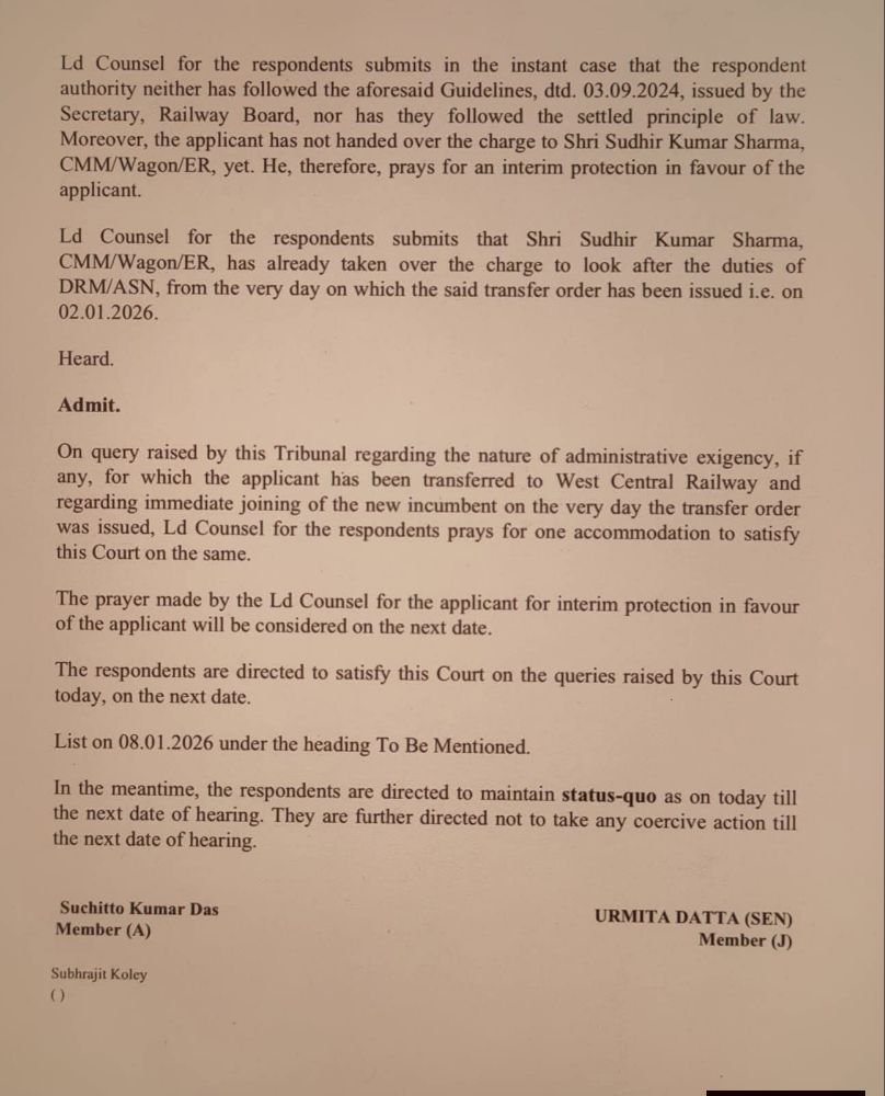 उनका स्थानांतरण बिना अवसर और सुनवाई दिए, तथ्यों की अपूर्ण समझ के आधार पर किया गया है, जो प्राकृतिक न्याय के सिद्धांतों का उल्लंघन है।CAT में हुई सुनवाई से जुड़े दस्तावेजों की छह पन्नों की प्रतियां भी सामने आई हैं, जिन्हें मामले के समर्थन में प्रस्तुत किया गया है। अब 8 जनवरी 2026 की सुनवाई पर सभी की निगाहें टिकी हैं, जहां यह तय होगा कि रेलवे प्रशासन अपने फैसले को कैसे न्यायोचित ठहराता है।