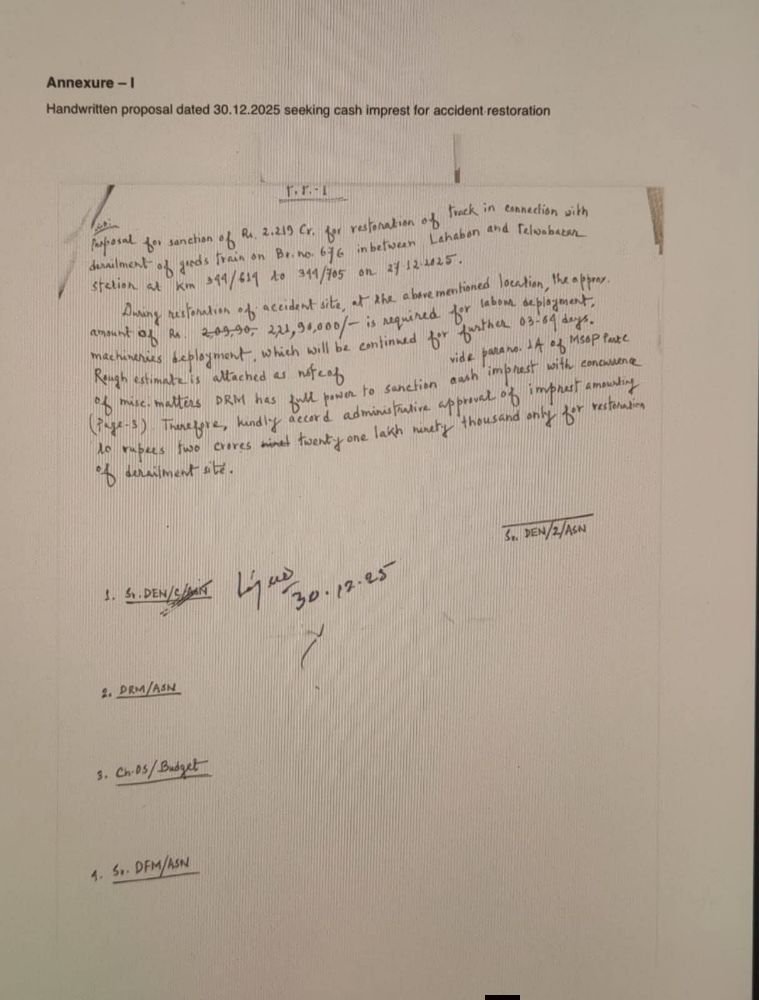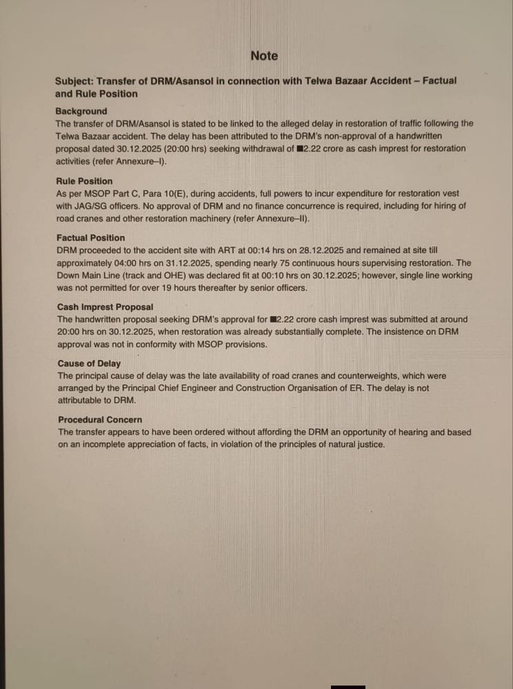DRMआसनसोल का स्थानांतरण तेलवा बाजार दुर्घटना के बाद यातायात बहाली में कथित देरी से जोड़ा जा रहा है। यह देरी 30 दिसंबर 2025 को रात 8 बजे प्रस्तुत 2.22 करोड़ रुपये के कैश इम्प्रेस्ट के हस्तलिखित प्रस्ताव को DRM द्वारा अनुमोदन न दिए जाने से जोड़कर बताई गई।हालांकि, MSOP Part-C, Para 10(E) के अनुसार दुर्घटना की स्थिति में बहाली से संबंधित व्यय की पूर्ण शक्तियाँ JAG/SG अधिकारियों को निहित हैं। ऐसे मामलों में DRM की स्वीकृति या वित्तीय सहमति आवश्यक नहीं होती, तथा रोड क्रेन और अन्य बहाली उपकरणों की हायरिंग के लिए स्वतंत्र अधिकार पहले से मौजूद हैं।तथ्य जो DRM के पक्ष मेंDRM विनीता श्रीवास्तव 28 दिसंबर 2025 को रात 00:14 बजे ART के साथ दुर्घटना स्थल पर पहुंचीं और 31 दिसंबर सुबह लगभग 04:00 बजे तक (करीब 75 घंटे) लगातार मौके पर मौजूद रहकर बहाली कार्य की निगरानी की।डाउन मेन लाइन (ट्रैक और OHE) को 30 दिसंबर 2025 को 00:10 बजे फिट घोषित कर दिया गया था, फिर भी वरिष्ठ अधिकारियों द्वारा 19 घंटे से अधिक समय तक सिंगल लाइन वर्किंग की अनुमति नहीं दी गई।2.22 करोड़ रुपये के कैश इम्प्रेस्ट का प्रस्ताव 30 दिसंबर को रात 8 बजे प्रस्तुत हुआ, तब तक बहाली कार्य लगभग पूरा हो चुका था।वास्तविक देरी का कारण रोड क्रेन और काउंटरवेट की देर से उपलब्धता रहा, जिसकी व्यवस्था पूर्व रेलवे के प्रिंसिपल चीफ इंजीनियर और कंस्ट्रक्शन ऑर्गनाइजेशन द्वारा की जा रही थी।इन तथ्यों के आधार पर DRM को देरी के लिए जिम्मेदार ठहराना MSOP प्रावधानों के अनुरूप नहीं बताया जा रहा है।