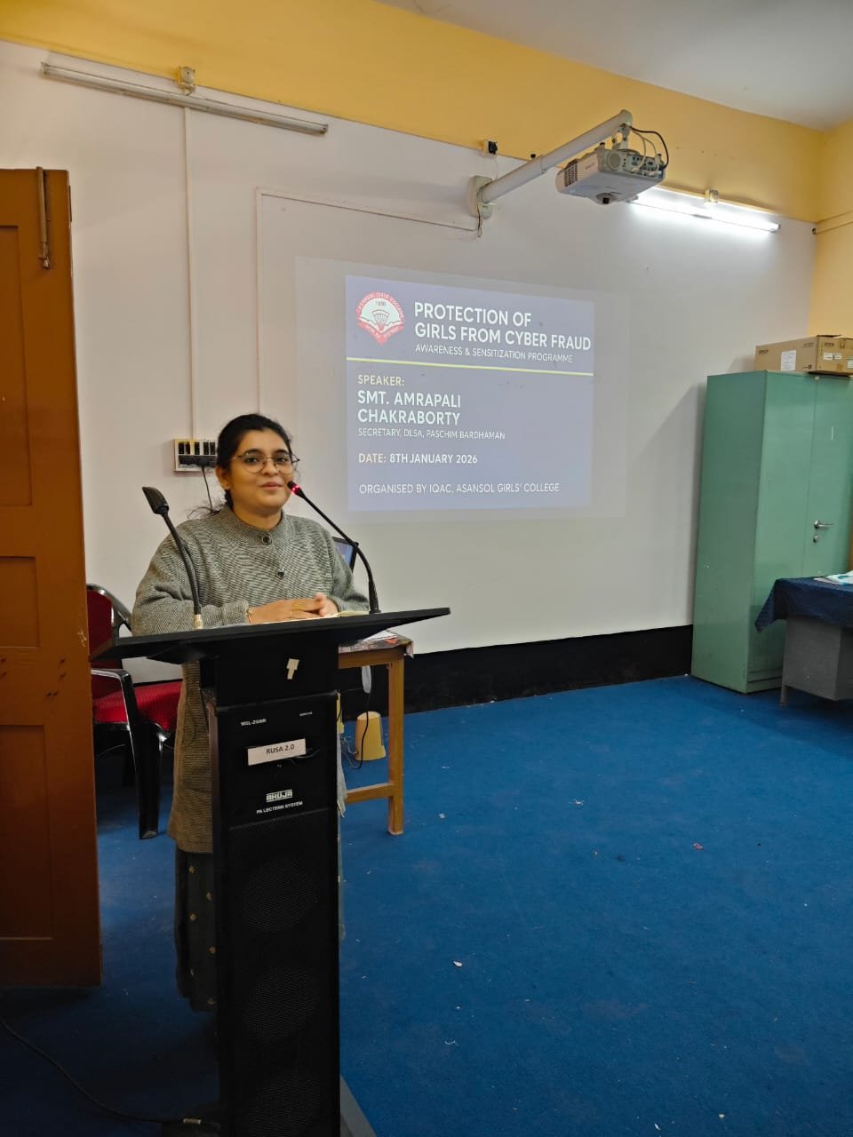 मुख्य वक्ता के रूप में न्यायमूर्ति श्रीमती अम्रपाली चक्रवर्ती, सचिव, जिला विधिक सेवा प्राधिकरण (डीएलएसए), पश्चिम बर्द्धमान ने संबोधित किया। उन्होंने विभिन्न प्रकार की साइबर धोखाधड़ी, पीड़ितों के लिए उपलब्ध कानूनी उपायों तथा ऑनलाइन सुरक्षा सुनिश्चित करने के लिए आवश्यक सावधानियों पर विस्तृत जानकारी प्रदान की। साथ ही, उन्होंने छात्राओं को बिना किसी भय के साइबर अपराधों की रिपोर्ट करने एवं आवश्यकतानुसार कानूनी सहायता लेने के लिए प्रोत्साहित किया।इस कार्यक्रम में कॉलेज के 50 से अधिक छात्राओं एवं शिक्षकों की सक्रिय सहभागिता रही। कार्यक्रम का समापन एक संवादात्मक चर्चा के साथ हुआ, जिससे यह कार्यक्रम अत्यंत जानकारीपूर्ण एवं प्रभावशाली सिद्ध हुआ।