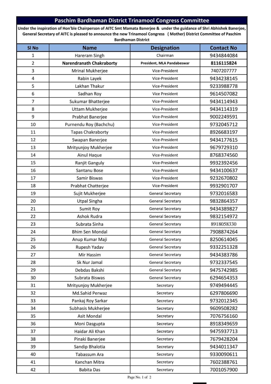 बंगाल मिरर, आसनसोल/दुर्गापुर : पश्चिम बर्धमान जिले में तृणमूल कांग्रेस संगठन को मजबूत करने के उद्देश्य से जिला तृणमूल कांग्रेस (मदर) की नई जिला समिति की घोषणा की गई है। यह समिति अखिल भारतीय तृणमूल कांग्रेस की राष्ट्रीय अध्यक्ष ममता बनर्जी की प्रेरणा और पार्टी के राष्ट्रीय महासचिव अभिषेक बनर्जी के मार्गदर्शन में गठित की गई है।घोषित सूची के अनुसार, हरेराम सिंह को जिला समिति का चेयरमैन बनाया गया है, जबकि पांडेश्वर के विधायक नरेंद्रनाथ चक्रवर्ती को जिला अध्यक्ष की जिम्मेदारी सौंपी गई है। इसके अलावा बड़ी संख्या में उपाध्यक्ष, महासचिव, सचिव, कोषाध्यक्ष, संयुक्त कोषाध्यक्ष, विशेष आमंत्रित सदस्य और कार्यकारिणी सदस्य नियुक्त किए गए हैं।