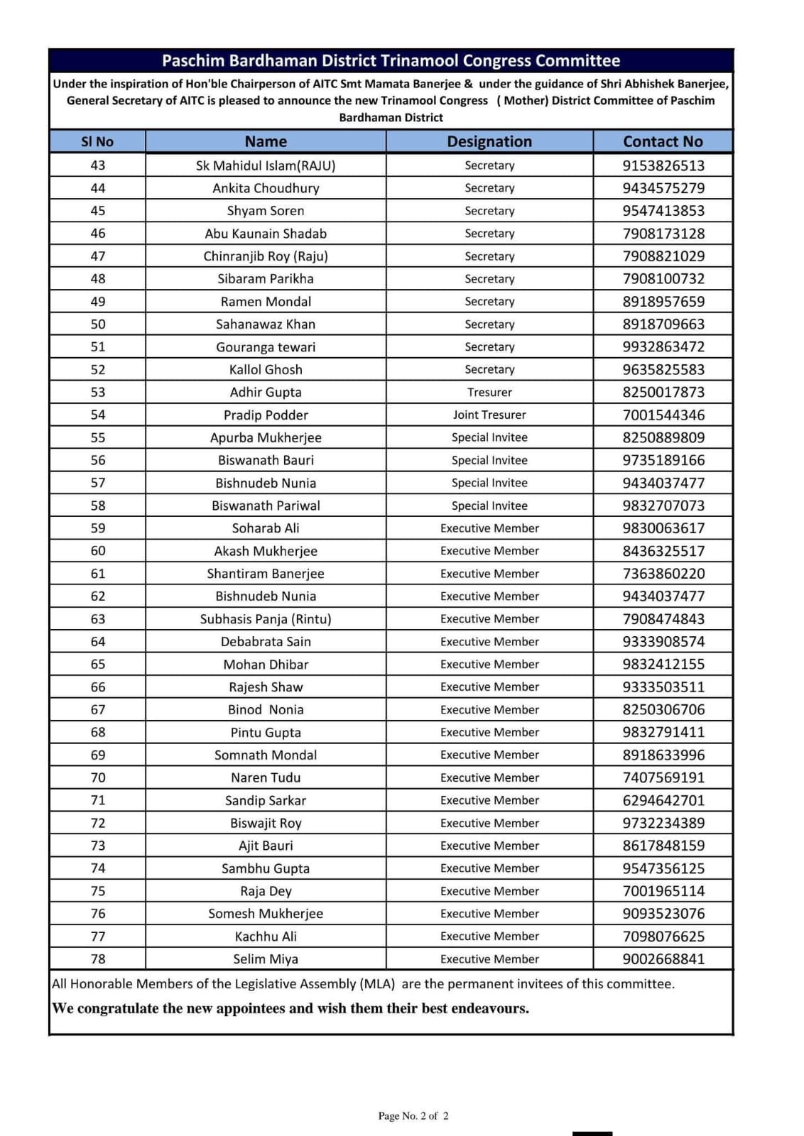 नई समिति में जिले के विभिन्न विधानसभा क्षेत्रों और सामाजिक वर्गों के नेताओं को स्थान दिया गया है, जिससे संगठनात्मक संतुलन और जमीनी स्तर पर पार्टी की पकड़ और मजबूत होने की उम्मीद जताई जा रही है। पार्टी सूत्रों के अनुसार, नई जिला समिति आगामी चुनावों और संगठनात्मक कार्यक्रमों को और अधिक सक्रिय तथा प्रभावी ढंग से संचालित करेगी।तृणमूल कांग्रेस की ओर से सभी नवनियुक्त पदाधिकारियों और सदस्यों को शुभकामनाएं दी गई हैं तथा उनसे पार्टी के हित में समर्पित भाव से कार्य करने की अपील की गई है। पार्टी नेतृत्व का मानना है कि इस नई टीम के नेतृत्व में पश्चिम बर्धमान जिले में तृणमूल कांग्रेस का संगठन और अधिक सशक्त होगा।