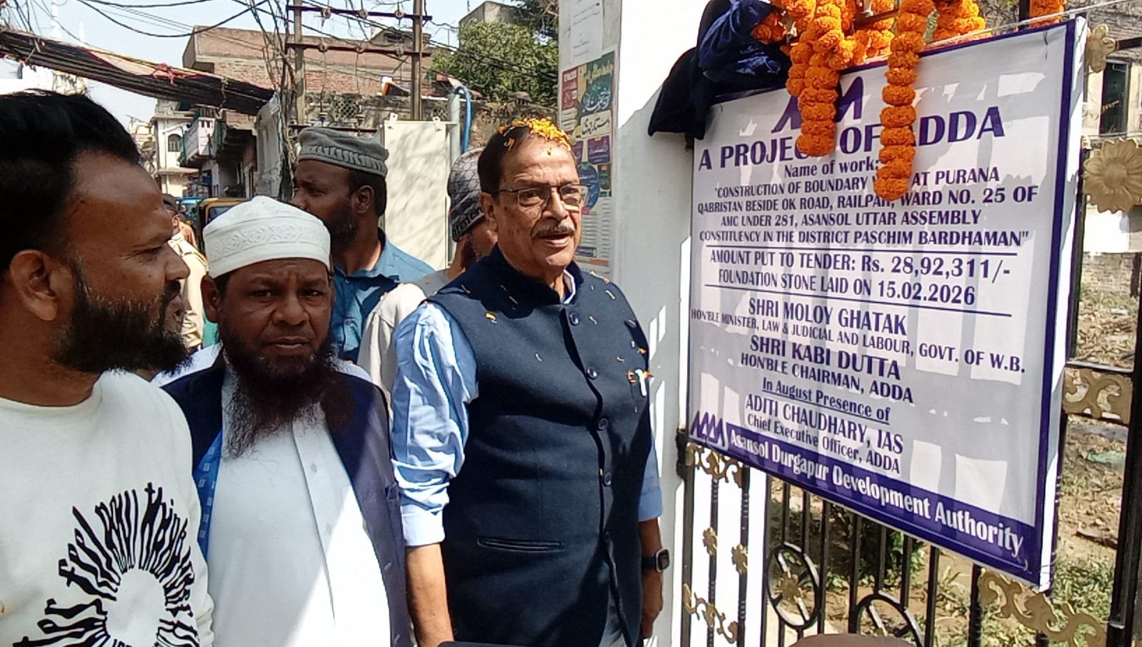 বেঙ্গল মিরর, আসানসোল, রাজা বন্দোপাধ্যায়ঃ* আসানসোল পুরনিগমের ২৫ নম্বর ওয়ার্ডের রেলপার এলাকার ওকে রোডে পুরনো কবরস্থানে সীমানা প্রাচীর বা বাউন্ডারি ওয়াল তৈরির কাজের ভিত্তিপ্রস্তর স্থাপন করলেন রাজ্যের আইন ও শ্রম মন্ত্রী মলয় ঘটক। এদিন এই উপলক্ষে হওয়া এক অনুষ্ঠানে মন্ত্রী সহ অন্যান্যরা উপস্থিত ছিলেন। আসানসোল দুর্গাপুর উন্নয়ন পর্ষদ বা আড্ডা এই সীমানা প্রাচীর নির্মাণে আর্থিক সহায়তা করেছে। মন্ত্রী মলয় ঘটক এদিন এই কাজের ভিত্তিপ্রস্তর স্থাপন করে বলেন, এই সীমানা প্রাচীর নির্মাণে প্রায় ২৯ লক্ষ টাকা ব্যয় হবে। তা দেবে আড্ডা।