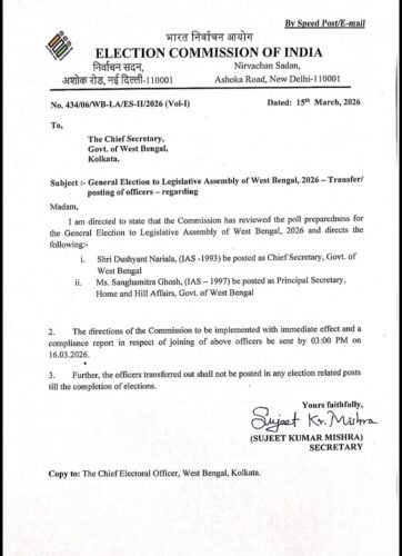 बंगाल मिरर, कोलकाता: पश्चिम बंगाल में होने वाले विधानसभा चुनाव 2026 को लेकर भारत निर्वाचन आयोग ने बड़ा प्रशासनिक फैसला लिया है। चुनाव की तैयारियों की समीक्षा के बाद आयोग ने राज्य के कुछ वरिष्ठ आईएएस अधिकारियों के तबादले और नई नियुक्तियों के निर्देश जारी किए हैं।निर्वाचन आयोग द्वारा 15 मार्च 2026 को जारी आदेश के अनुसार, 1993 बैच के आईएएस अधिकारी दुश्यंत नारियाला को पश्चिम बंगाल सरकार का मुख्य सचिव (Chief Secretary) नियुक्त करने का निर्देश दिया गया है। वहीं 1997 बैच की आईएएस अधिकारी संगमित्रा घोष को गृह एवं पर्वतीय मामलों की प्रधान सचिव (Principal Secretary, Home and Hill Affairs) के पद पर तैनात करने को कहा गया है।