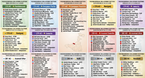 🔹 276 AC – दुर्गापुर पूर्व (Durgapur Purba) * सिमंत चटर्जी – CPIM * प्रदीप कुमार मजूमदार – AITC * चंद्रशेखर बनर्जी – BJP * देवेश चक्रवर्ती – INC * किरणमयी मंडल – SUCI * पापिया धीवर – आमरा बंगाली * रुबिया बेगम – आम जनता उन्नयन पार्टी * मो. नियाज अहमद – गोंडवाना गणतंत्र पार्टी * मृणाल कांति साहा – निर्दलीय * दीपक ढाली – निर्दलीय