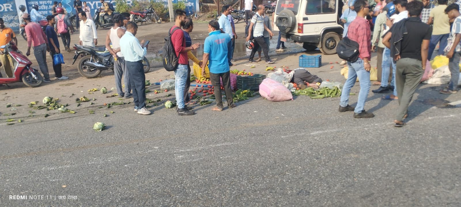 बंगाल मिरर, अंडाल : Andal Airport मोड़ के सामने राष्ट्रीय राजमार्ग 19 पर सोमवार सुबह करीब साढ़े सात बजे एक दर्दनाक सड़क दुर्घटना हो गई। यह हादसा उस समय हुआ जब सब्जी से लदा एक पिकअप वैन Sen Market से अंडाल की ओर आ रहा था।मिली जानकारी के अनुसार, रोज की तरह सब्जी विक्रेता दुर्गापुर से सब्जियां खरीदकर अंडाल में बेचने के लिए लौट रहे थे, तभी अचानक वाहन दुर्घटनाग्रस्त हो गया। इस हादसे में वाहन में सवार एक सब्जी विक्रेता की मौके पर ही मौत हो गई, जबकि अन्य कई लोग घायल हो गए। घायलों को हल्की चोटें आई हैं।