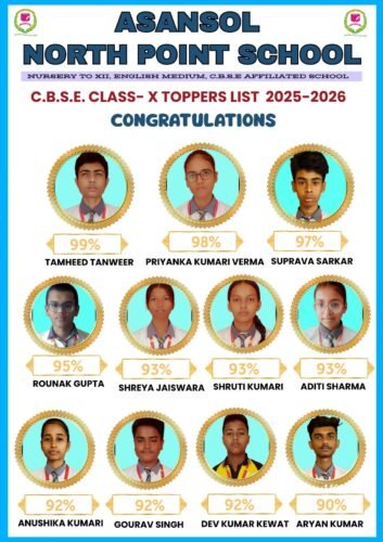 बंगाल मिरर, आसनसोल, राजा बंदोपाध्याय: Asansol North Point School ने इस शैक्षणिक वर्ष में केंद्रीय माध्यमिक शिक्षा बोर्ड (सीबीएसई) कक्षा 10 की बोर्ड परीक्षा में उत्कृष्ट प्रदर्शन करते हुए अपनी शैक्षणिक गुणवत्ता का शानदार उदाहरण पेश किया है। इस वर्ष परीक्षा में शामिल हुए 162 छात्र-छात्राओं का परिणाम बेहद सराहनीय रहा।प्राप्त जानकारी के अनुसार, 11 छात्रों ने 90 प्रतिशत और उससे अधिक अंक हासिल किए हैं। वहीं 45 छात्रों ने 80 प्रतिशत से अधिक अंक प्राप्त किए, जबकि 146 छात्र-छात्राओं ने 60 प्रतिशत और उससे अधिक अंक लाकर सफलता प्राप्त की।इस शानदार उपलब्धि में तामहीद तनवीर ने 99 प्रतिशत अंक प्राप्त कर विद्यालय में प्रथम स्थान प्राप्त किया। उनके बाद प्रियंका कुमारी वर्मा ने 98 प्रतिशत अंक हासिल कर दूसरा स्थान प्राप्त किया। वहीं सुप्रवा सरकार ने 97 प्रतिशत अंक लाकर विद्यालय का नाम रोशन किया।