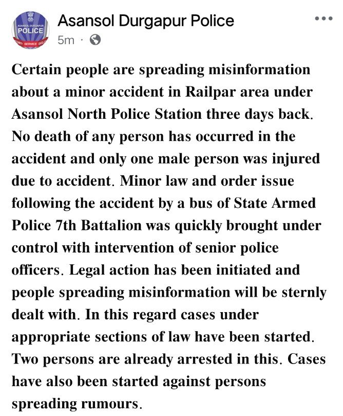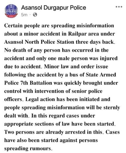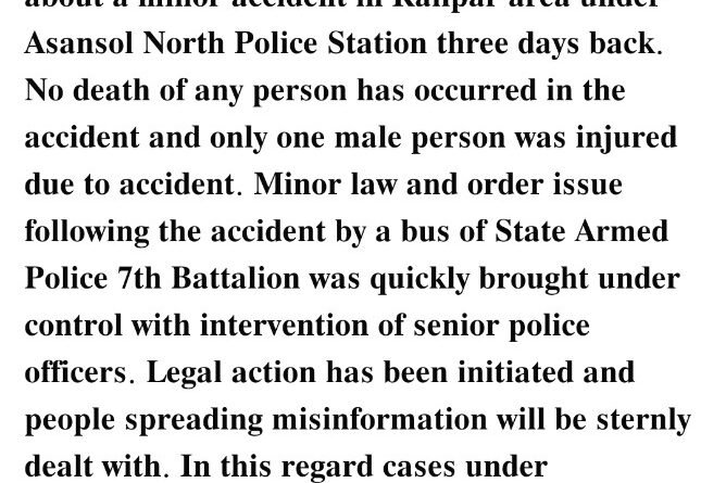 बंगाल मिरर, आसनसोल: आसनसोल उत्तर थाना अंतर्गत रेलपार क्षेत्र, आसनसोल में तीन दिन पहले हुए एक मामूली सड़क हादसे को लेकर कुछ लोगों द्वारा भ्रामक जानकारी फैलाने का मामला सामने आया है। इस घटना को लेकर पुलिस प्रशासन ने स्पष्ट किया है कि दुर्घटना में किसी भी व्यक्ति की मौत नहीं हुई है।